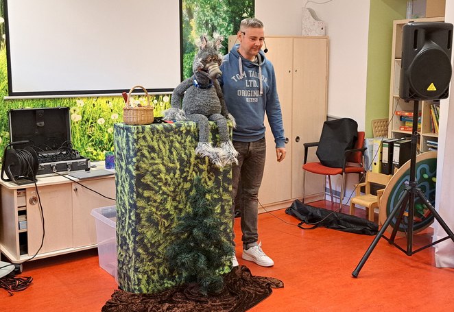 Nachdem die Kulisse und Stuhlreihen aufgebaut wurden, konnte es auch schon losgehen: Bauchredner Stephan Dahms hat das Märchen Rotkäppchen in einer neuen, humorvollen Version, in der der Wolf alles andere als böse, sondern tollpatschig, ängstlich und liebenswert ist, aufgeführt. Der Bauchredner bezog die Kleinen auch immer wieder ein, indem sie kleine Rollen wie die des Rotkäppchens oder des Jägers übernehmen durften.