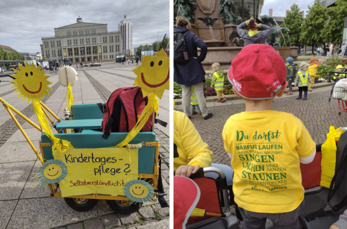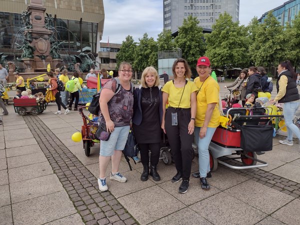 Auch Leipzig erstrahlte am 29. Mai in gelb! Der Aktionstag startete mit einem Kinderwagenkonvoi vom Augustusplatz über den oberen Ring zum Rathaus. Alle Teilnehmer:innen kamen in gelber Kleidung und mit gelb geschmückten Kinderwagen – darunter auch vier Tagesmütter unserer Outlaw-Kindertagespflege Leipzig – und nutzten auch die Gelegenheit, mit interessierten Passant:innen ins Gespräch zu kommen.