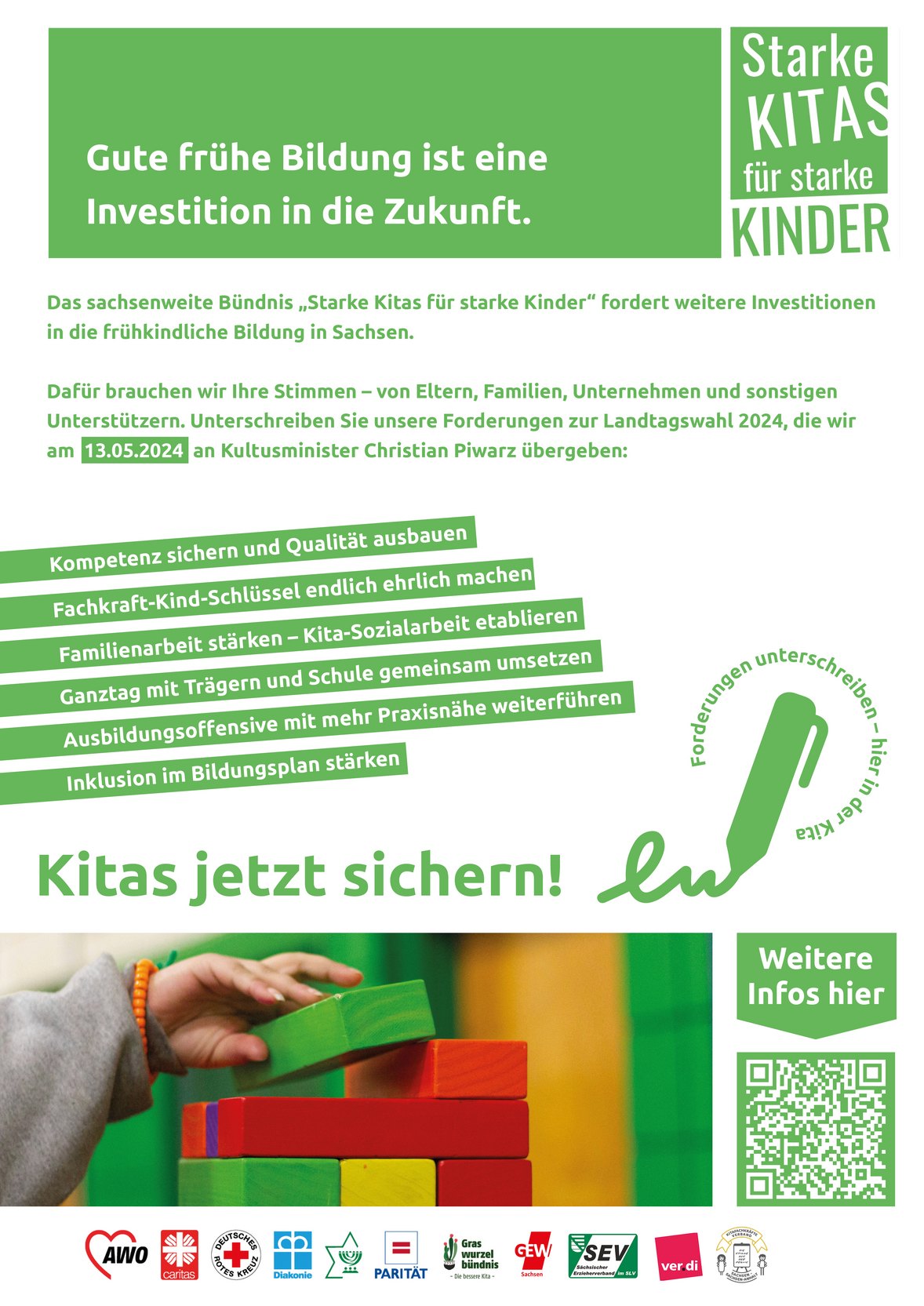 Die gesammelten Unterschriftenlisten übergeben wir gemeinsam mit den Bündnispartner:innen am 13. Mai, dem Tag der Kinderbetreuung, vor dem Kultusministerium in Dresden. Wir freuen uns, wenn Sie uns dabei unterstützen: