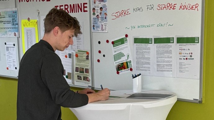 Das sachsenweite Bündnis „Starke Kitas für starke Kinder“ aus den Spitzenverbänden der Freien Wohlfahrtspflege, Gewerkschaften, Kita-Trägern und der Kita-Praxis fordert deutlich bessere Rahmenbedingungen für die frühkindliche Bildung. Um breite Unterstützung aus der Bevölkerung zu dokumentieren, startete das Bündnis eine Unterschriftenaktion in den sächsischen Kitas. Auch unsere Einrichtungen an den Standorten in Leipzig und Dresden sind dabei und sammelten in den vergangenen Wochen Unterschriften - von Eltern, Fachkräften und allen Interessierten. An Aktionsständen stellten die Kita-Teams die Forderungen des Bündnisses vor und zeigten auf, warum die Investitionen in die frühkindliche Bildung der sächsischen Kindertagesbetreuung dringend notwendig sind - wie in unserer Kita Rehefelder Straße, in Dresden (Foto).