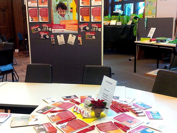 Nach der Begrüßung durch die LggK-Landeskoordinatorinnen Steffi Markhoff und Solongo Myagmar, ging es nach zwei Impulsvorträgen in die Vormittags-Workshops. Hier diskutierten die Teilnehmer*innen in Kleingruppen unter anderem zu Themen wie zum Beispiel "Gelingende Zusammenarbeit mit psychisch auffälligen Eltern" oder "Dialoge schaffen". Im Anschluss gingen sie mit frischem Input in die Mittagspause und fanden sich jeweils mit Kolleg*innen aus denselben Bezirken an einen Mittagstisch wieder. Fast nahtlos ging es in den "Markt der Möglichkeiten" über. Outlaw präsentierte sich an einem 'Markt'-Stand mit dem Schwerpunkt Kita-Sozialarbeit. Hier informierten die vier teilnehmenden Outlaw-Kita-Sozialarbeiterinnen über ihren Arbeitsalltag, Chancen, Hürden und die ersten Erfolge. Durch Steffi Markhoff moderiert wechselten die Gesprächspartner*innen nach einer Zeitvorgabe bei Bedarf die Tische. Der Outlaw-Tisch war die ganze Zeit über sehr gut besucht und es fanden viele angeregte Gespräche statt.