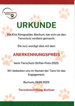 Tierschutz-Stifter-Preis: Anerkennungspreis für Kita Königsallee in Bochum