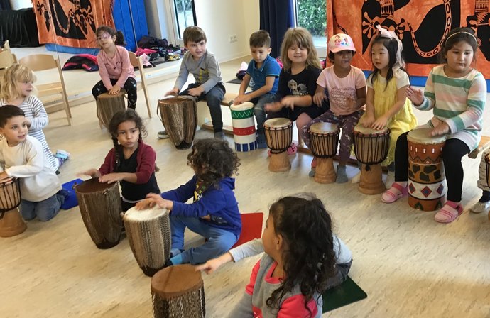 Oft ganz laut, dann wieder ganz leise tönen die Trommeln durch die Kita Gronowskistraße: Letzte Woche durften alle Kinder zwischen 3 und 6 Jahren mit afrikanischen Trommeln auf die Reise gehen.
