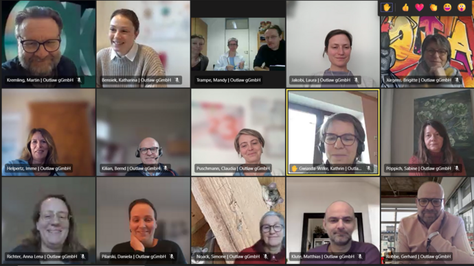 Erstes Gesamttreffen: Zum Start ins neue Jahr 2023 gab es auch bei den Familienanalogen Angeboten (FAA) bei Outlaw ein Novum. Nach der Klausurtagung im November 2022 auf Norderney trafen sich nun erstmals alle Fachberater:innen des FAA-Bereiches zu einer digitalen Gesamtteam-Sitzung, um sich über Arbeitsschwerpunkte, die Zusammenarbeit und Ideen für das laufende Jahr auszutauschen. Ebenfalls dabei waren das gesamte Leitungsteam der FAA bei Outlaw mit Gesamtleiter Gerhard Robbe, den Fachgebietsleitungen Matthias Klute, Bettina Horn (NRW und Bremen/Niedersachsen) und Martin Kremling (Sachsen und Leipzig, Sachsen-Anhalt und Brandenburg) sowie Katharina Bensiek (Qualitätsentwicklung FAA).