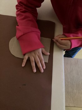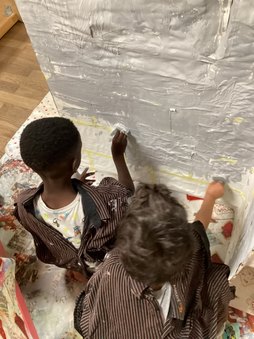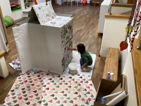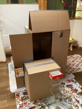 Als Grundgerüst für den Laden diente ein großer Karton. "Wie auch schon in der Vergangenheit hat uns Heiko, der Lebenspartner einer Kollegin, wieder großzügig mit stabilen Kartons versorgt", erzählt Alina Nessel. Für eine Langlebigkeit des Kaufladens planten die Erzieher:innen die Konstruktion, bevor es mit den Kindern an die Umsetzung des Hausbaus ging. Zuerst rissen die Drei- bis Sechsjährigen zahlreiche Zeitungen in kleine Stücke und verklebten das gesamte Haus mit Kleister. Diese Schicht verleiht dem Bau eine zusätzliche Stabilität und sollte eine gut bemalbare Oberfläche schaffen. Im Prozess stellten sie fest, dass sich die beschichtete Zeitung nicht optimal für das spätere Anmalen eignete. Die Kinder hatten daraufhin die wunderbare Idee: "Dann tapezieren wir das Haus – wie ein richtiges Haus!" Gesagt, getan! Mit viel Kleister und Tapete entstand eine glatte und feste Oberfläche. Dann mussten sich die Kinder erst einmal in Geduld üben, bis alles für die weitere Gestaltung trocknete. Einheitlich entschieden sie sich für die Wandfarbe Grau. Mit Kreppband klebten die Erzieher:innen und Kinder ein Steinmuster auf und tupften die Farbe mit Schwämmen sorgfältig drüber. Als das Kreppband abgezogen wurde, staunten die Kinder: "Wow, das sieht aus wie eine echte Mauer! Das Dach fehlt noch!" Und so machten sie sich direkt an die Arbeit und zeichneten die Dachziegel auf einer Pappe mit einer Schablone vor, schnitten sie aus und klebten sie Stück für Stück auf das Dach.