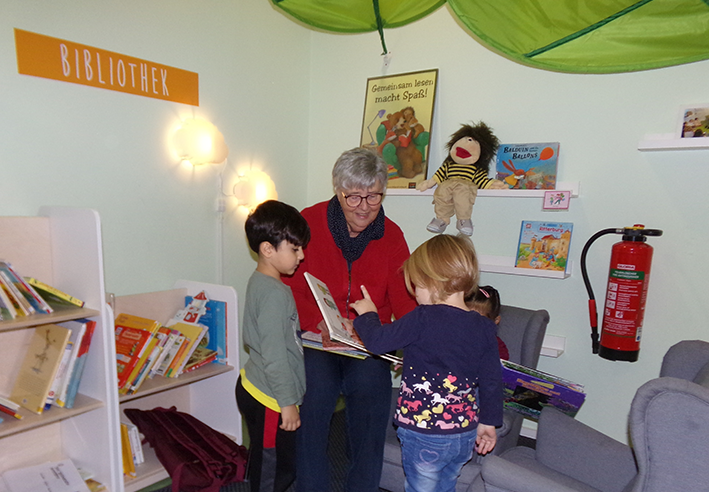 In unseren Outlaw-Kitas besuchen unter anderem Vorlesepat:innen die Kids, um ihnen etwas vorzulesen – so zum Beispiel in der Kita Feidikstraße in Hamm: Dort kommt jede Woche eine Leseoma vorbei und liest den Kindern Geschichten vor.