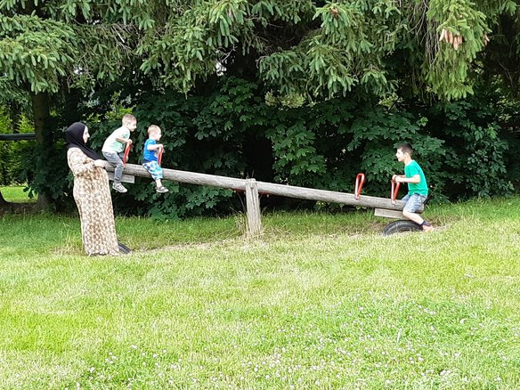 Das Grillen von Würstchen, Fleisch und Grillkäse übernahm ein Vater, der schon beim letzten Mal am Gasgrill stand. In der Zwischenzeit wurde vom Küchenpersonal das üppige Buffet eingedeckt. „Da wir eine muslimische Familie aus Tschetschenien und einige Vegetarier*innen dabei hatten, war für alle kulinarischen Bedarfe etwas dabei“, beschreibt Kerstin Prendel und ergänzt: „ Alle wurden satt – wir konnten sogar am nächsten Tag noch Grillgut für zu Hause verteilen.“