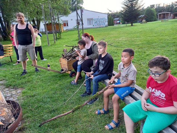 Nach dem Abendessen ließ die Reisegruppe am Lagerfeuer den Abend im gemütlichen Gespräch ausklingen. Die Kinder spitzten sich Spieße an, um noch Marshmallows zu grillen. Und die Pädagog*innen nutzten die Gelegenheit, um in der großen Runde und unter Beteiligung von Klient*innen die Bundesfreiwillige Frau Gneipel mit einem Geschenk, einer Collage und dankenden Worten zu verabschieden.