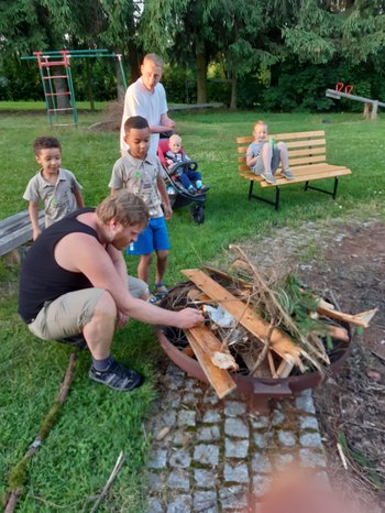 Zum Glück konnte am Abend das Lagerfeuer nachgeholt werden und noch vor dem Abendessen machten sich 3 Betreuer*innen, ein Vater und einige Kinder mit dem Bollerwagen auf den Weg, um trockenes Holz in der Umgebung zu suchen. Hier konnten vor allem die Kinder ihre Kräfte beim Zerbrechen von großen Ästen einsetzen.