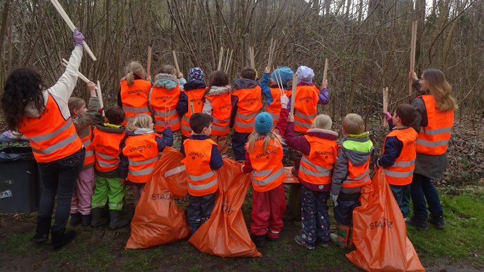 In Bochum fand zum wiederholten Male der USB Stadtputz statt und die Kita Dr.-C.-Otto-Straße schloss sich dem Frühjahrsputz-Projekt an. Ausgestattet mit Handschuhen, Greifzangen und Abfallsäcken befreiten die Vorschulkinder fleißig den nahegelegenen Wald und Spielplatz „Hedtberg“ in Bochum-Dahlhausen von Abfällen.