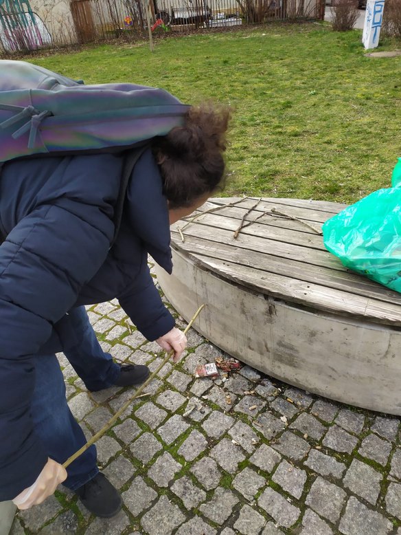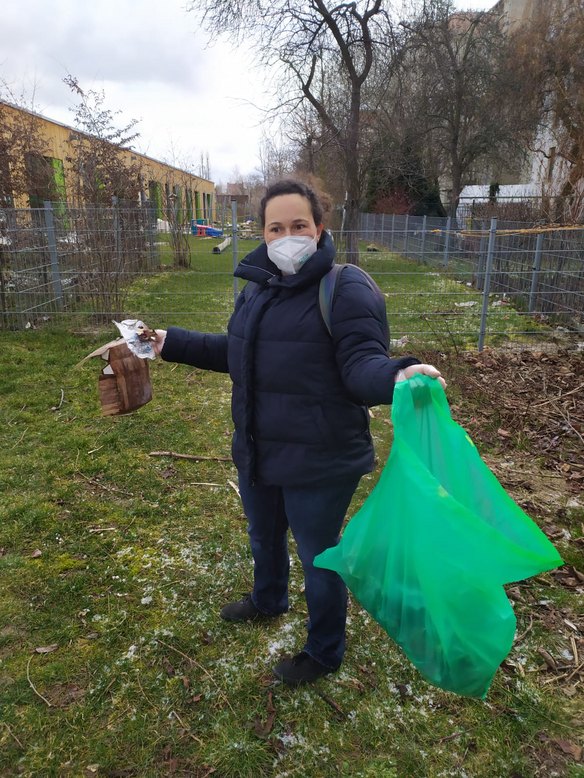 Bei der „Cleanup Leipzig“ kommen Menschen mindestens einmal im Monat zusammen, um beliebte Plätze in ihrem Viertel gemeinsam von Müll zu befreien. Leider finden wir den Vorplatz der Kita fast täglich in einem verunreinigten Zustand vor. Viele Menschen aus der Nachbarschaft nutzen die Sitzgelegenheiten, um dort gemeinsam zusammenzukommen. Leider nehmen sie ihren Müll oft nicht mit, hinterlassen unzählige Zigarettenreste und vieles mehr.