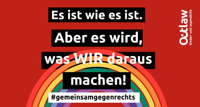 Demokratie, Vielfalt, Offenheit, Toleranz – für diese Grundwerte stehen wir ein bei Outlaw und unsere Haltung ist klar: Alle Menschen sind gleich, bei uns ist kein Platz für Ausgrenzung, Diskriminierung und Hass! Unsere Werte werden an allen Standorten, in allen Teams gelebt. Denn es ist unsere Pflicht und Verantwortung, alle Menschen zu unterstützem und auf ihrem Weg zu begleiten. Wir stehen ein für eine pluralistische Gesellschaft – und diese zu beschützen ist unser aller Aufgabe!