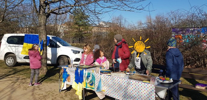 Und so bastelten die Mädchen und Jungen in der letzten Woche Friedenstauben und backten verschiedene Kuchen und Muffins – verziert in den Farben der ukrainischen Flagge. Danach starteten alle gemeinsam zur nahe gelegenen Parkanlage des Thüringer Bahnhofs in Halle (Saale), um das Gebäck zu verkaufen. Auch die Mitarbeiter:innen im Team waren aufgerufen, sich zu beteiligen.