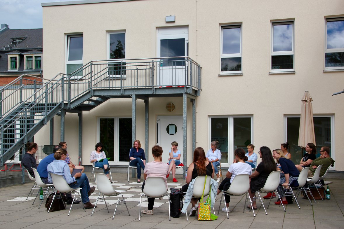 "Wo drückt der Schuh in der frühen Bildung?" Das wollte Jan Donhauser, Bildungsbürgermeister der Stadt Dresden, mit dem Team der Kita Rehefelder Straße diskutieren. Damit hielt er sein zur Kita-Preisübergabe im September 2020 gegebenes Versprechen, die Preisträger-Kita unter diesem Motto erneut zu besuchen. Das Treffen konnte nach langem Warten aufgrund der Schutzmaßnahmen bezüglich der Corona-Pandemie gemeinsam mit Sabine Bibas, Leiterin des Amtes für Kindertagesbetreuung in Dresden, am 30. Juni 2021 stattfinden. Neben dem Kita-Team sowie Leitungsteam Katja Hillenbrand und Susanne Luther war auch Kita-Bereichsleiterin Ulrike Herlt anwesend. Kita-Leiterin Katja Hillenbrand moderierte durch die Abendveranstaltung, die bei sommerlichen Temperaturen auf der Terrasse der Kita stattfand.