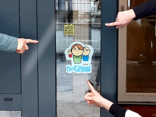 Einheitliches Zeichen der Notinsel-Partnerschaften ist der Aufkleber an der Eingangstür, auf dem drei Kinder stilisiert über dem Motto "Wo wir sind, bist Du sicher." abgebildet sind. Die teilnehmenden Notinsel-Partner*innen unterschreiben zuvor eine Selbstverpflichtung. In einer Handlungsanweisung, die auch regionale Notrufnummern bereithält, wird erläutert, was im Notfall zu tun ist. Auf diese Weise können Kinder im Fall von Gefahr und Gewalt in die Notinseln flüchten und erhalten kompetente Hilfe.